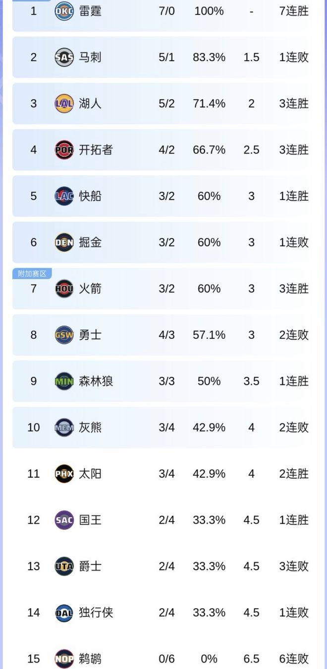 北京时间11月3日,NBA常规赛中,共进行了8场较量,其中包括3场西部内战,雷霆的对手是鹈鹕(主队在前),太阳对马刺,湖人打热火,而爵士以及灰熊则都东征,分别面对黄蜂跟猛龙。今日的比赛战罢,随着湖人3连胜,马刺遭首败,西部最新排行:开拓者第4召回杨瀚森。