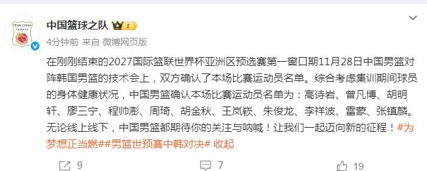 2027篮球世界杯亚大区预选赛第一阶段即将拉开帷幕,中国篮球之队官方公布了中国男篮首场主场对阵韩国男篮的12人大名单,队长赵睿缺席令人意外,周琦、曾凡博与张镇麟等领衔。中国男篮将在11月28日19点30主场对阵韩国男篮,阵容实力升级的中国男篮剑指开门红。